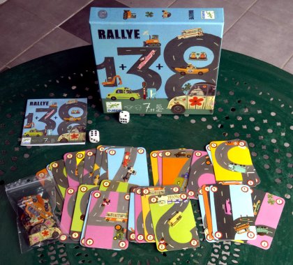 Rallye est presque un travail d'école. Après avoir lancé deux dés, chacun doit présenter des cartes de sa main pour obtenir le total demandé en additionnant et/ou soustrayant des cartes. Par exemple, pour réussir à faire 7, vous pouvez jouer 1+3+3 ou 8+1-2. Quand on ne peut pas jouer, on doit piocher une carte et quand on termine ses cartes (on a pile poil les cartes pour faire le total demandé), on gagne un point. Ça peut donc durer longtemps ! Au boulot !