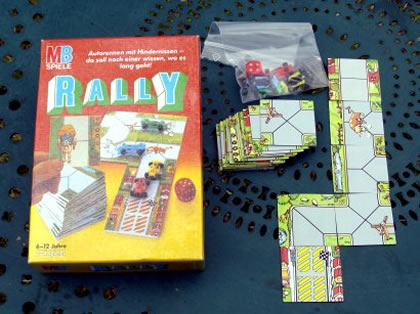 Il s'agit en fait d'un jeu de l'oie, dont on constitue le parcours au fur et à mesure qu'on avance. Quelques cartes-cases recèlent des événements qui permettent de rejouer, de passer un tour, etc. La seule bonne idée, c'est le choix offert au joueur entre jeter le dé ou poser une nouvelle tuile. Mais cette idée n'est pas exploitée, et un joueur qui jette le dé et ne peut pas avancer n'a pas d'autre pénalité. Il aurait suffi de peu de chose pour que le jeu trouve de l'intérêt, mais ce peu de chose est hélas absent. Les jolies petites voitures, et la possibilité de transformer facilement Rally en un jeu de Fair Play en y adjoignant un simple jeu de cartes, évitent au jeu le sceau infamant du sens interdit. |