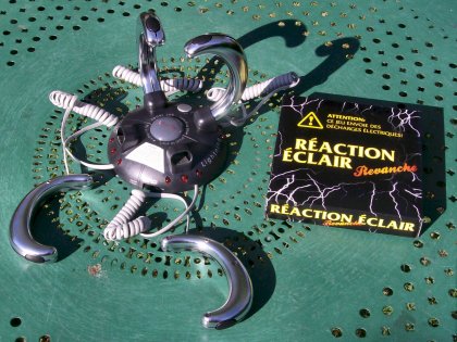 Impossible de résister à l'achat, quand je suis tombé par hasard devant ce jeu que j'avais eu l'occasion d'essayer et de voir jouer auparavant. Réaction éclair revanche n'est pas véritablement un jeu puisque le but est simplement de ne pas recevoir une décharge électrique. Le gagnant ne reçoit rien, sinon le plaisir vicieux de regarder la tête des autres. Un « jeu » pour sado-masochistes, attirant comme tout ce qui fait un peu peur et froid dans le dos. Fortement déconseillé aux personnes sensibles, aux jeunes joueurs, aux cardiaques et aux porteurs de pacemakers. |