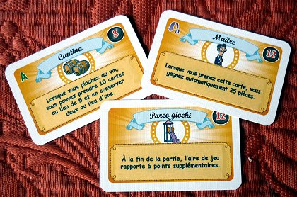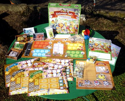 Ristorante Italia aurait pu être un de mes coups de cœur. Mais il souffre de deux défauts. D'une part, le tour de jeu est un peu long selon les critères actuels, surtout quand on joue à cinq. D'autre part, il n'existe pas en français, l'éditeur ayant probablement considéré que les Français ne s'intéresseraient pas à un jeu parlant de gastronomie. Il est difficile de ne pas rapprocher Ristorante Italia d'une autre création au thème similaire : À la carte. Pourtant, les deux sont très différents. Ici, il s'agit d'élaborer des menus et des recettes en allant chercher les différents ingrédients en boutique. L'interaction est assez faible. Puisqu'on ne sait pas quels plats préparent les adversaires, il est difficile de leur mettre des bâtons (de berger) dans les roues (de gruyère). Ristorante Italia fourmille d'éléments : recettes, vins, aliments divers et variés, tables de restaurant, livres de cuisine et même étoiles. S'adressant à un public familial, les règles sont beaucoup plus simples que ce qu'on pourrait penser en voyant les douze pages du livret. Après une ou deux parties de la version de base, on va vite jouer à la version « avancée ». Elle introduit divers éléments nouveaux, le principal étant des cartes bonus qui donnent des pouvoirs spéciaux si on les acquiert.