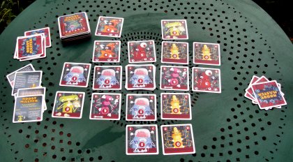 C'est un jeu de levées à deux joueurs, où les antagonistes posent petit à petit les cartes qui constitueront les combinaisons finales. Mais ici, les cartes posées sont communes aux deux joueurs. Chacun essaye de tirer le meilleur parti d'un matériel commun. En ce sens, le jeu rappelle un peu Cassa Grande de Roland Siegers. Le second mécanisme sera familier aux amateurs du « Doktor ». Le score de chaque joueur est celui formé par sa plus faible combinaison. On retrouve un principe utilisé avec bonheur dans de nombreux jeux de l'auteur, et qui devient un peu sa marque de fabrique. Comme les cartes ne sont pas toutes distribuées entre les joueurs, un peu d'impondérable vient se glisser dans le jeu, ce qui n'est pas pour me déplaire. Poker MasterJeu très fortement inspiré de Robot Master avec un jeu de 32 cartes Il est facile de se rendre compte de l'intérêt de Robot Master en jouant à l'adaptation décrite ci-dessous et jouable avec un simple jeu de 32 cartes. But du jeuFormer une meilleure combinaison de poker que son adversaire, à partir d'une matrice commune de 5 x 5 cartes, l'un des joueurs formant des combinaisons verticales, l'autre des combinaisons horizontales. Mise en placeBattre le jeu, distribuer 12 cartes cachées à chaque joueur. Placer le reste des cartes en pile face cachée au centre de la table. Décider qui va commencer, et qui joue les colonnes ou les rangées Déroulement du jeuOn retourne la carte du dessus de la pile. Elle devient la carte centrale du jeu qui sera composé de 5 colonnes et 5 lignes de cartes. Tour à tour les joueurs déposent une de leurs cartes à côté d'une carte déjà posée, sans sortir des limites. Lorsque les 24 cartes ont été posées, on détermine le gagnant. Chaque joueur ayant formé 5 combinaisons de poker, on détermine pour chacun la combinaison la moins forte. Celui des joueurs qui possède la meilleure combinaison parmi ces moins fortes gagne la manche. On peut jouer des haricots. L'esprit du jeu est le même mais évidemment, on ne bénéficie pas des subtilités de décompte imaginées par l'auteur, ni de la qualité des illustrations de Patrick Cerf. Dragon MasterÀ chaque fois que Reiner Knizia sort un jeu, un jeu dans le jeu consiste à rechercher sous quel nom il avait déjà été publié.