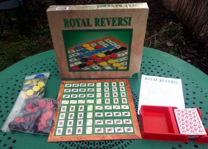 Ne vous faites pas d'illusion : le Royal Reversi présenté ici, et publié par Dujardin en 2000, n'a rien à voir avec le Royal Reversi auquel il est fait allusion dans la littérature ludique de la fin du xixe siècle. Celui-ci est une sorte de croisement entre Othello et Sequence, une façon de démontrer qu'en mélangeant deux bons jeux, on peut en créer un fort médiocre. De l'auteur, on ne connait que les initiales « RG », comme c'est souvent le cas de ceux qui confient leurs créations à Bar Licencing Agency (BLA).