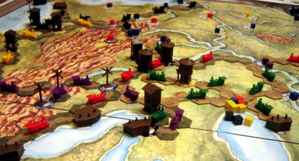 Après que mes amis québéco-suisses m'ont fait découvrir Railroad Tycoon, je ne pouvais plus résister à faire entrer ce monstre (de la taille d'un appartement parisien, il recouvre ma table verte et au-delà) dans ma collection. Le matériel magnifique et les règles abordables en font un incontournable. Mais la durée des parties m'empêche hélas d'y jouer aussi souvent que je le souhaiterais. Indispensable dans tout bon club de jeu.