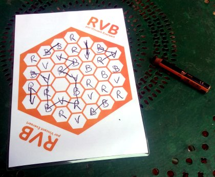 Le jeu de Nim est totalement résolu. Quand on connaît la méthode, on peut facilement plumer son petit cousin. Mais quand les deux joueurs connaissent la méthode, le jeu ne présente plus d'intérêt. Basé sur le même principe, RVB n'est en revanche pas résolu, ce qui en fait un jeu nettement plus intéressant. L'idée est de remplir d'abord les cases d'un tablier de 37 cases hexagonales avec les initiales des couleurs Rouge, Vert et Bleu. Puis, à tour de rôle, chacun doit barrer une ou plusieurs cases adjacentes en prenant garde de toujours laisser au moins un R, un V et un B, faute de quoi, on a perdu la partie. Le joueur dont c'est le tour peut, au choix :