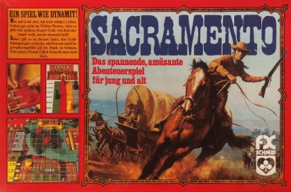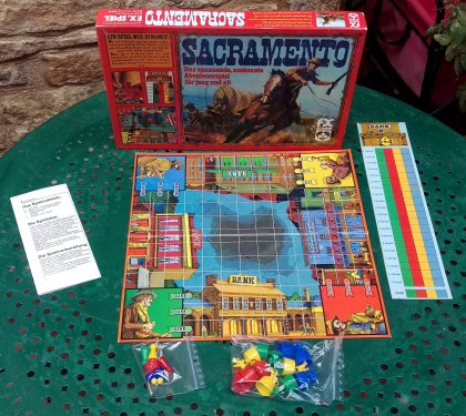 Dans Sacramento, deux à quatre joueurs tentent de transporter secrètement une pépite d'or (une petite bille en bois) de leur base à la banque située en face. Pour cela, ils disposent de trois cavaliers : un qui cache la pépite sous sa selle et deux leurres. Amener une pépite à la banque rapporte 50 000 $. On peut aussi défier un cavalier adverse en arrivant sur sa case. Il doit alors dévoiler sa base. S'il transportait une pépite, il doit ramener tous ses cavaliers au départ et le joueur qui l'a défié gagne 50 000 $. Sinon, c'est l'accusateur qui doit retourner à sa base. L'idée est amusante. Elle est malheureusement desservie par un défaut majeur : on entend la petite bille en bois quand on déplace un cavalier. Pour pallier ce défaut, nous recommandons de remplacer la bille en bois par un petit morceau de pâte à fixer, collé sous le socle du cavalier chargé de transporter l'or.