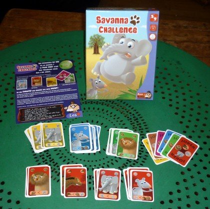 La règle annonce que Savanna Challenge s'apparente à La Bataille. C'est vrai si l'on prend, à chaque levée, la première carte de son paquet. Mais ce n'est pas précisé. On peut donc imaginer que chaque joueur dispose de ses douze cartes en main, ce qui semble incompatible avec l'âge de destination du jeu : de trois à cinq ans. En fait, il va vous falloir adapter la règle à l'âge des protagonistes : plus le nombre de cartes en main est important, plus le jeu fait appel à la décision, et plus il est difficile. La variante pour les plus grands ajoute des jokers, qui peuvent remplacer n'importe quel animal. Les cartes, bien conçues, portent en bas les prises autorisées. Cela permet d'aborder facilement ce jeu de prise cyclique avec de jeunes joueurs. |