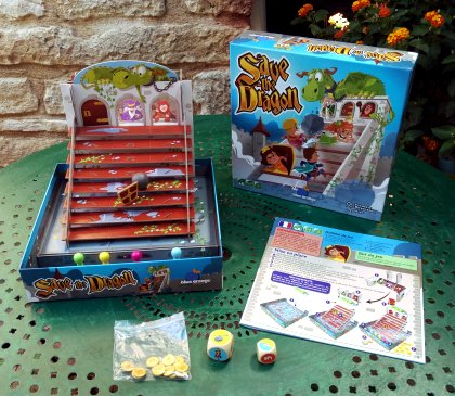 Difficile de résister à l'attrait du beau matériel de Save the Dragon ! Tous les joueurs essayent de gravir le grand escalier pour atteindre le château et délivrer Save the Dragon est un jeu de course tactique abordable dès 5 ans, plein de rebondissements et très interactif. Quel plaisir de faire tomber les pions des adversaires ! Dommage qu'il faille démonter le sommet du château entre chaque partie, car si on laisse faire les jeunes joueurs, les cartons ne résisteront pas bien longtemps.