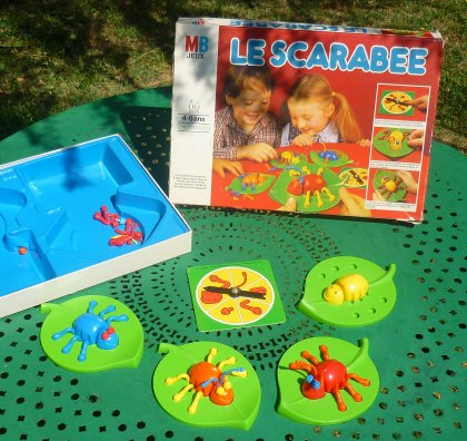 Le Scarabée est très proche du classique Le Cochon qui rit. Ce n'est pourtant pas lui qui lui succède, puisqu'il lui est même antérieur de quelques années. Le jeu, destiné aux très jeunes joueurs, est complètement soumis au hasard. La petite difficulté, c'est qu'il faut d'abord placer le corps, avant toute autre pièce, et que les yeux et antennes ne peuvent être montés qu'après la tête.