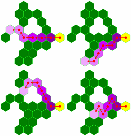 Le nombre de tuiles touchées dépend de la force du séisme, soit de 1 à 6. Ci-dessous, 4 progressions possibles d'un séisme de force 6 :