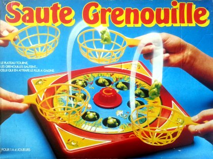 Saute grenouille est l'ancêtre de Saute-grenouille - électro. Le principe est identique, mais ici, pas d'électricité pour faire sauter les batraciens. Pour mettre le jeu en marche, il faut tourner la molette centrale à l'aide de ses biceps. On comprend facilement pourquoi ce concept archaïque a été abandonné, au profit de piles coûteuses et polluantes.
