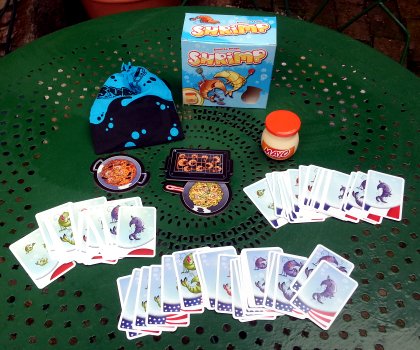 Shrimp est un jeu d'action rapide à base de cartes représentant des crevettes. Vous devez vous précipiter sur le pot de mayonnaise qui fait « pouêt » dès que vous voyez trois cartes qui forment une combinaison valable : même couleur, même nombre, même taille, même quantité ou même origine. Mais il est également possible de s'emparer de 3 cartes si le nombre de crevettes égale sept, ce qui constitue un cocktail. Jusqu'ici, rien de bien nouveau. La difficulté, c'est qu'il faut, en même temps qu'on frappe le pot de mayonnaise, annoncer intelligiblement ce qu'on a vu, par exemple « crevettes vertes » ou « crevettes moyennes ». Si vous annoncez deux critères, vous gagnez encore plus de cartes et si, par bonheur, vous voyez et annoncez trois critères, alors vous gagnez carrément la partie. Set ou Shrimp ?Le paquet de cartes de Shrimp contient quatre-vingt-une cartes caractérisées par une quantité, une couleur, une taille et une origine. Quatre-vingt-une cartes et quatre critères : exactement comme dans votre jeu de Set ! Il est donc tout à fait possible de jouer à Shrimp avec une boîte de Set, mais il faudra rajouter un pot de mayonnaise. Ou de jouer à Set avec une boîte de Shrimp : il vous suffira pour cela de rajouter la règle de Shrimp dans votre boîte de Set.