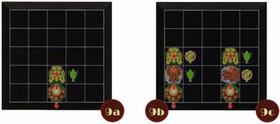 Au départ, seules les trois montagnes sont présentes au centre du tablier. Les animaux rentrent par une case de bord, puis se déplacent orthogonalement, de n'importe quel côté. Ils peuvent même quitter le jeu, généralement pour rentrer ailleurs. Un animal peut pousser une pièce ou un ensemble de pièces. Le plus fort, c'est qu'il peut pour cela se servir de la puissance des pièces adverses. La poussée ne peut se faire que s'il existe une supériorité numérique qu'on peut résumer comme suit (excusez-moi, j'aime bien mathématiser) : - un animal a une force et une résistance de 1 dans le sens de la