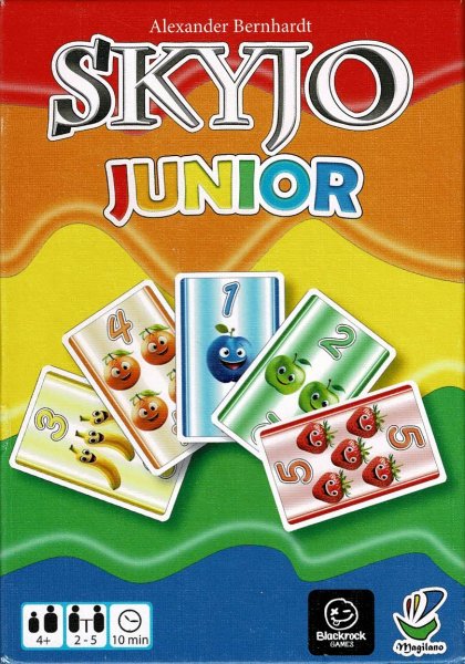 Skyjo Junior est l'adaptation du best-seller dérivé du classique Golf. On passe de 12 à 5 valeurs de cartes et des petits dessins de fruits (qui a raconté à l'éditeur que les enfants aimaient les fruits ?) remplacent les austères illustrations de son aîné.