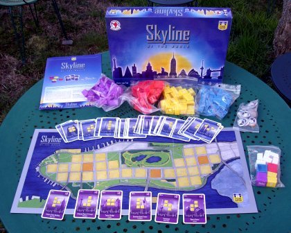 Attiré par plusieurs avis positifs sur des sites dignes de confiance (ne me demandez pas lesquels, je ne veux pas me faire d'ennemis), j'ai décidé que Skyline of the World devait entrer dans ma collection malgré un inconvénient majeur : il n'existe pas de traduction officielle française. La règle anglaise étant relativement abordable, il n'a pas été très difficile d'y jouer. Bien qu'ayant fini bon dernier, j'ai apprécié la qualité des mécanismes, et une originalité à laquelle je ne m'attendais pas, tant le jeu ressemble par son aspect à d'autres (difficile de ne pas penser à Manhattan par exemple).