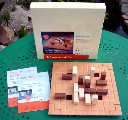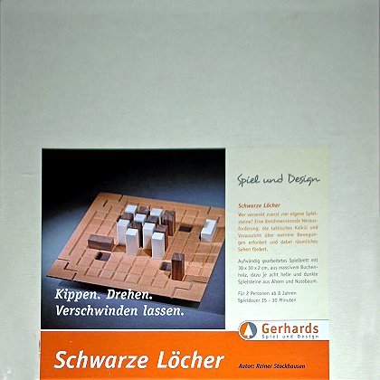 Schwarze Löcher attire immédiatement l'œil par la sobriété de ses formes et la qualité de sa finition. Dans ce jeu purement combinatoire, les joueurs essayent de faire disparaître trois de leurs pièces. Les pièces ont deux positions possibles : couchée ou dressée. Une pièce dressée dispose de quatre mouvements : se coucher dans l'une des quatre directions. Une pièce couchée dispose également de quatre mouvements : deux roulements et deux redressements. Pour sortir une pièce, il faut l'amener en position couchée à côté d'un trou, petit côté dirigé vers celui-ci, puis redresser la pièce de sorte qu'elle disparaisse dans le trou. Ces mouvements ne sont pas évidents à programmer. De plus, vous avez en face de vous un énergumène qui prend un malin plaisir à vous mettre des bâtons dans les roues. Une fois maîtrisés les déplacements, le jeu devient un grand plaisir. Le but n'est pas d'empêcher l'adversaire de parvenir à ses fins, mais bien d'y parvenir avant lui. Vous apprenez vite des coups qui à la fois le gênent, et vous avancent vers une position gagnante. Les amateurs de jeux combinatoires vont adorer.