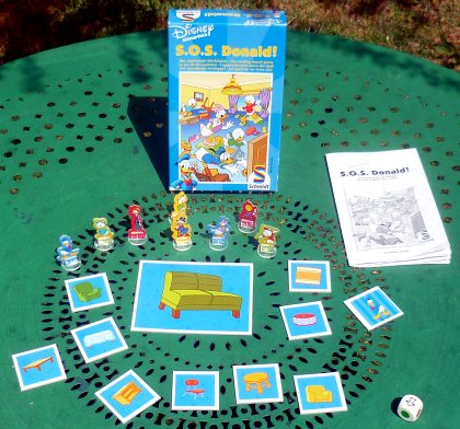 L'idée de S.O.S. Donald est simple et sympathique : être le premier à sortir de la maison les deux membres de la famille Duck dont on a la charge. Une inondation étant intervenue, on se déplace en marchant sur les meubles. Chacun s'occupe donc de deux pions. Mais en même temps, on est parfois contraint d'avantager un peu les autres. Un pion avance simplement vers le prochain meuble libre, éventuellement en sautant un ou plusieurs meubles occupés. Pour déterminer quel pion avance, on se fie à la couleur du dé :