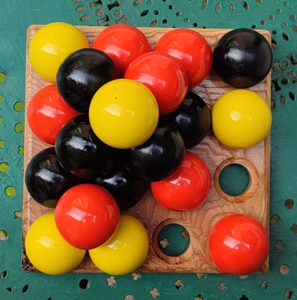 Une bille ne peut être placée sur une plate-forme 2x2 que si au moins un côté de la pyramide ainsi créée forme un triangle équilatéral avec une bille de chaque couleur à ses extrémités. Autrement dit, au moins un côté de la pyramide doit avoir une bille blanche, noire et rouge à ses coins. Cela peut être vérifié à tous les niveaux, jusqu'au niveau du plateau.