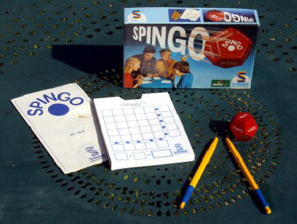 Spingo contient un unique dé à douze faces, quelques feuilles de marque et quatre stylos. Pourtant cela suffit pour faire un jeu attrayant avec ce qu'il faut d'interaction, de hasard et de culture. Tous les joueurs reçoivent une grille de 5 × 5 cases et un stylo. À tour de rôle ils jettent le dé et choisissent une lettre parmi les quatre de la face supérieure visible. Tous les joueurs doivent alors reporter cette lettre sur leur grille, à l'emplacement qui leur semble le plus judicieux. Le mécanisme est en fait assez proche de celui utilisé dans Take it Easy! Lorsque les grilles sont intégralement remplies, après le vingt-cinquième coup, chacun comptabilise ses points : dans chaque ligne ou colonne, un mot rapporte sa longueur en points.