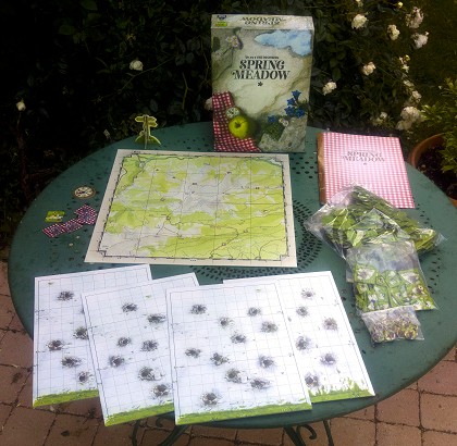 Toute la subtilité du jeu vient du choix, dans un grand tableau commun, des pièces que l'on va poser ensuite sur son tableau individuel. Un joueur chevronné peut tenter de prévoir plusieurs coups à l'avance les pièces qu'il prendra par la suite. En fait, si l'on choisit la variante où la réserve des futures pièces est visible à l'avance, il n'y a aucun hasard. Mais il n'est pas pour autant facile de déterminer quelles pièces prendront les adversaires et quelles pièces ils nous laisseront. Il peut être tactiquement intéressant de ne pas gagner la première manche en disposant des pièces qui n'intégreront que plus tard les lignes de de notre tableau. Mais attention à ne pas se faire déborder ! À deux joueurs, Spring Meadow est un jeu combinatoire. Il le reste à quatre joueurs, à condition de jouer en équipe (il faut alors gagner 3 manches). À trois joueurs, le jeu souffre d'un léger déséquilibre puisque le troisième joueur n'a potentiellement pas accès à toutes les pièces du tableau central : il ne peut accéder qu'aux diagonales, à la colonne centrale et à la ligne centrale alors que les deux autres joueurs peuvent accéder aux 25 cases du tableau. Avec Spring Meadow, Uwe Rosenberg décroche son cinquième coup de cœur dans la collection de l'Escale à jeux.