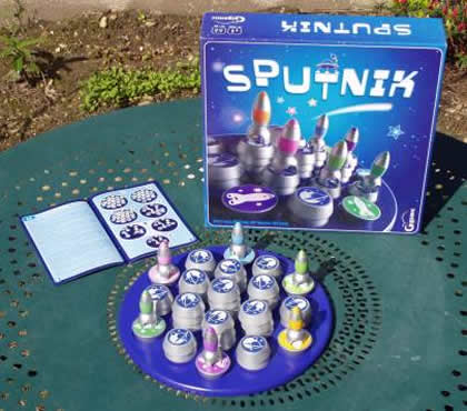 Une nouveauté importante : la fusée repose au départ sur une base qui lui sert en même temps de secours. Si à un moment de la partie la fusée se trouve en difficulté, sans aucune galaxie libre à côté d'elle, le joueur prend sa base, la retourne, et la pose sur une case vide du tablier. La base se comporte ensuite comme une galaxie ordinaire qui peut être occupée par n'importe qui ou retirée du jeu. Quivive, en devenant Sputnik, a plutôt gagné au change. Le nouveau jeu est réellement magnifique, avec ses fusées peintes et ses galaxies argentées. |