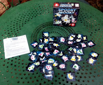 Spooky Wooky est un ensemble de soixante-trois tuiles : sept formes, trois couleurs (vert, jaune et rose), trois valeurs (1, 2 et 3). Toutes les cartes sont retournées face cachée. On se met d'accord sur la règle choisie puis on commence à retourner les cartes une à une. Dès qu'une nouvelle carte montre la même condition qu'une carte déjà retournée, il faut être le plus rapide à attraper cette carte. Par exemple, si la règle choisie est « forme identique », dès qu'une carte apparaît montrant la même forme qu'une autre carte déjà retournée, il faut attraper cette carte déjà retournée. On peut un peu compliquer le jeu en donnant deux conditions, par exemple forme et couleur. Mais on reste très loin de la complexité d'un jeu comme Set, qui s'adresse à des joueurs plus chevronnés.