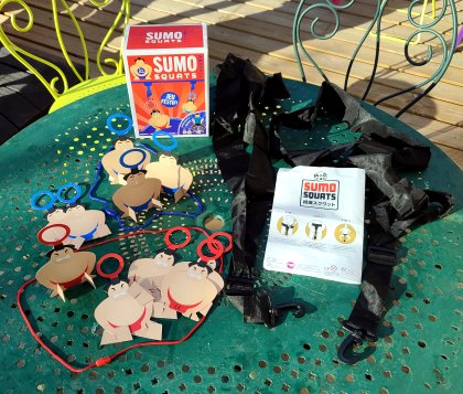 Inspiré de certains jeux de kermesse, Sumo Squats est un petit jeu d'adresse et de rapidité pour deux joueurs. Chacun accroche une ceinture autour de sa taille qui laisse pendre un cordon terminé par un crochet. Dix petits sumotoris en carton sont posés au sol, surmontés d'un anneau. Il va falloir, avant son adversaire, accrocher ces sumotoris en s'accroupissant habilement pour les déposer ensuite dans l'arène de sa couleur. Pendant ce temps, les autres convives se moquent des joueurs.