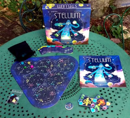 Stellium renouvelle agréablement l'univers des jeux d'arrangement. Les billes (pardon, les astres) qui sortent du sac rejoignent le plan de jeu et provoquent des transformations. Les déplacements d'astres et autres rotation de galaxies modifient continuellement les emplacements des astres. Puisqu'il est difficile de programmer un objectif, on essayera plutôt de profiter de la situation à l'instant donné et d'en tirer le meilleur parti. La grande originalité du jeu réside dans le choix de l'astre que l'on pioche dans le sac. Les quatre billes ont non seulement des couleurs mais aussi des rugosités différentes. Vous disposez de cinq secondes pour trouver au toucher l'astre qui répondra à vos désirs. L'étoile jaune est facile à reconnaître mais pour les trois autres astres, c'est une autre affaire. La combinaison de ces divers mécanismes — objectif secret, reconnaissance au toucher et arrangement — donne un jeu étonnant et très addictif. Les parties sont assez rapides. On peut jouer à quatre ou à trois, mais c'est à deux joueurs que le jeu est le moins hasardeux. On y (re)joue quand vous voulez !