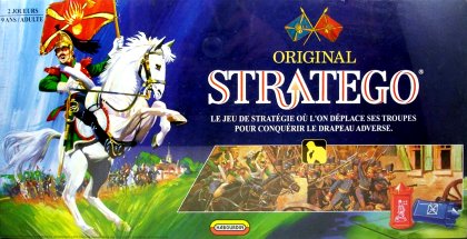 Il y a seulement quelques petites différences entre ces deux jeux, au niveau de la symbolique des pièces et du tablier. L’Attaque se joue sur un tablier de 9 cases sur 10 sur lequel chaque joueur place ses 36 pièces ; les passages d’un camp à l’autre se font par 4 couloirs entre trois rivières. Le Stratego se pratique sur un tablier de 10 cases sur 10 et chacun joue avec 40 pièces ; les deux camps sont séparés par deux lacs situés au centre du tablier, ce qui laisse trois passages pour atteindre le camp adverse. Quelques autres subtilités de prise du drapeau et de déplacement distinguent les deux jeux selon les versions. À partir de la fin des années cinquante, de nombreux jeux commercialisés ont été inspirés par la structure de L’Attaque-Stratego. CommentairesCette courte histoire du Stratego est un résumé de Michel Boutin à partir des contributions de Fred Horn (Stratego) et de Michel Boutin (L’Attaque) présentées à un Colloque organisé à la Haute École de Bruxelles (Institut pédagogique Defré) en décembre 2013, dont les actes ont été édités en janvier 2016. Voir les références ci-dessous : Art et savoir de l’Inde - Actes du colloque « Jeux indiens et originaires d’Inde » « Jeux indiens et originaires d’Inde », édité par Michel Van Langendonckt. L’ouvrage est disponible à la Haute École de Bruxelles, Catégorie pédagogique Defré, avenue De Fré, 62 - B 1180 Bruxelles ; tél.: +32 (0)2 374 00 99 ; e-mail : defre@heb.be Quelques boîtes de la collection de l'Escale à jeux1987 : édition Jumbo