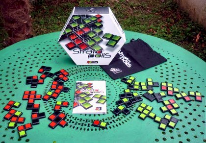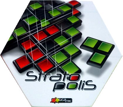 On n'attendait pas Annick Lobet, complice de Roberto Fraga et spécialiste comme lui des jeux déjantés, sur une création aussi sérieuse. Stratopolis est proposé avec une règle aussi simple qu'efficace. On trouve également quelques variantes, qui ne changent pas le principe du jeu mais permettent de l'adapter aux circonstances : on jouera avec un peu, beaucoup ou pas du tout de hasard. Stratopolis rappelle Toscana dans son principe. Les deux joueurs construisent ensemble un édifice, chacun cherchant à l'arranger au mieux de ses intérêts. La nouveauté vient ici de la troisième dimension. À la fin de la partie, chacun comptabilise sa meilleure région, en multipliant sa surface par sa hauteur, comme dans Torres. Il s'agit donc de construire en évitant de trop fractionner ses régions, pour leur assurer une plus grande surface. On essayera aussi, si l'adversaire n'est pas trop méchant, de rejoindre des zones séparées. La course au sommet est plus difficile, car on ne peut poser une pièce que sur deux ou trois autres, en respectant une règle : pas de rouge sur du vert, ni de vert sur du rouge. Le matériel est de grande qualité. On regrette un peu que les pièces ne s'emboîtent pas plus franchement, mais cela ne gêne en rien le jeu. Stratopolis ne prendra pas la poussière !
