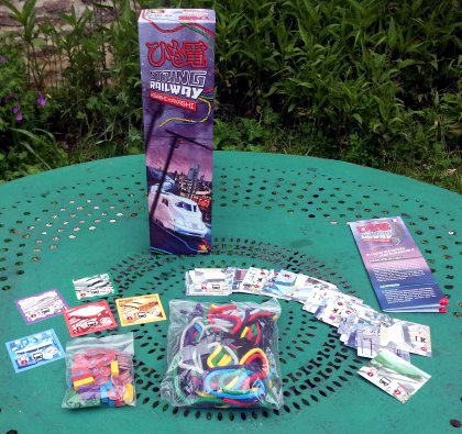 L'idée est de relier des gares par des voies ferrées, ce qui n'est pas nouveau. Les gares sont des petites tuiles en carton léger, les voies ferrées, des ficelles, ce qui est plus innovant. À tour de rôle, les joueurs piochent une gare, parfois deux. Ils doivent ensuite la disposer sur le terrain, puis poser une voie ferrée. En traversant des gares de bon rapport, on gagne des points de victoire. Si l'idée est amusante, la réalisation laisse franchement à désirer. Les tuiles représentant les gares portent des inscriptions minuscules, qui deviennent rapidement invisibles dès qu'une ou deux voies les traversent. Les jetons de points de victoire sont encore plus petits. Tous ces défauts semblent corrigés dans la version nord-américaine, franco-anglaise, malheureusement non distribuée en France. Veinards de Canadiens ! |