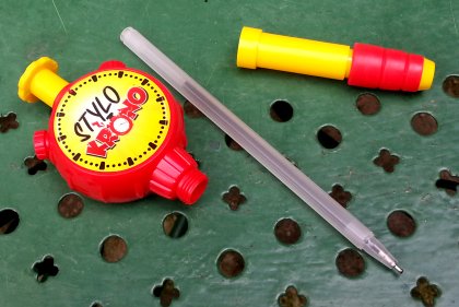 Le mécanisme est composé d'un stylo ordinaire, que l'on pourra aisément remplacer s'il vient à être usé par un stylo de même dimension comme un stylo Bic. Ce stylo est enfermé dans un tube surmonté d'un chronomètre. On déclenche le chronomètre en enfonçant le bouton, ce qui fait sortir le stylo qui va ensuite doucement rentrer dans le tube en 10 ou 15 secondes selon le réglage de la molette. En 15 secondes, il est tout à fait possible de faire deviner un objet. En 10 secondes, c'est souvent difficile. Un stratège pourra alors se demander si ça vaut le coup de commencer à dessiner. Mon conseil est donc de jouer plutôt en réglant le chronomètre sur 15 secondes et de ne passer à 10 secondes qu'entre joueurs particulièrement confirmés. Variante Escale à jeuxLe premier jouer décide, après avoir pris connaissance de la chose à dessiner, s'il joue en 10 ou en 15 secondes. S'il décide jouer en 10 secondes, on ajoute deux points au total des points à partager entre le dessinateur et le découvreur.