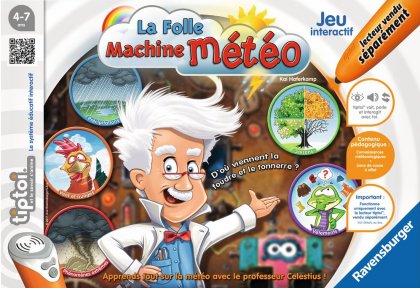 Tiptoi - La Folle Machine météo est un jeu didactique de découverte des phénomènes et événements météorologiques. Au gré des défis proposés, le jeune apprenti se familiarise avec les divers aspects du temps — précipitations, vents, température, etc. — en même temps qu'il apprend ou précise des termes spécialisés : ouragan, cyclone… Comme dans tous les jeux de la collection Tiptoi, on peut aussi pointer sur les images pour en apprendre plus. Tiptoi - La Folle Machine météo est l'un des jeux les plus intéressants de la collection Coup de cœur. Il s'adresse cependant à des enfants un peu plus âgés que la majorité des jeux de cette collection.