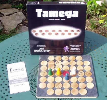 Le jeu combine deux des premiers jeux que j'ai aimés : Memory et Isola. La règle est cependant beaucoup plus subtile que dans un jeu de mémo classique : toutes les pièces quittées par un pion qui se déplace sont retournées et le restent jusqu'à ce qu'une paire apparaisse (attention aux faux amis). Le joueur prend alors les deux pièces, chacun observe une dernière fois les pions retournés, puis ils sont remis face cachée. Le terrain diminue à chaque prise et au jeu de mémoire vient s'adjoindre un intéressant et tactique jeu de déplacement et de blocage, puisque les pions ne peuvent se déplacer que vers une case occupée par un pion face cachée. Les cases vides comme les pions visibles sont des cases interdites. On peut ainsi empêcher un adversaire de jouer pendant parfois plusieurs tours (ce que j'aime faire car j'ai un mauvais fond). Tamega mériterait le coup de |