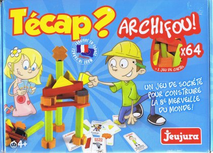 La relative petite boîte de Técap ? Archifou ! est bien remplie. On a même du mal à y ranger les soixante-quatre pièces de bois lasuré qui la composent. Contrairement aux apparences, Técap ? Archifou ! n'est pas un simple jeu de construction. C'est un véritable jeu de société qui oppose des bâtisseurs. À tour de rôle, chacun joue une carte. Elle lui permet de placer un morceau sur son édifice ou de réaliser une action, la plus drôle consistant à taper sur la table et de voir quelles constructions résistent. C'est encore plus drôle quand seul le bâtiment du joueur actif s'écroule ! Espérons que le rapprochement de Jeujura et de France Cartes - Ducale - Grimaud nous donnera à l'avenir d'autres jeux aussi dynamiques !