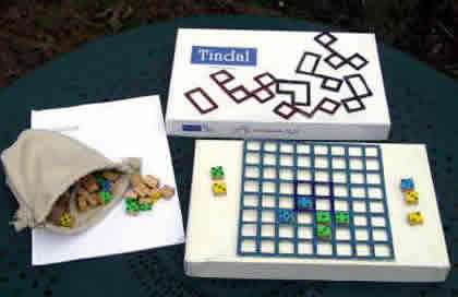 Tindal est constitué de soixante jetons : 1, 2, 3, 4 et 5 en trois couleurs, le tout répété quatre fois. On joue sur un tablier de 8 × 8 cases. Par ailleurs, on a besoin de huit « empreintes », qui sont des caches indiquant comment peuvent être joués les jetons. Au départ, chacun tire cinq jetons qu'il place face visible devant lui. Au premier tour, il faudra poser soit deux, soit trois jetons, en utilisant une des empreintes. Au tour suivant, il faudra poser les jetons restants : soit trois, soit deux. Le but est de former des lignes orthogonales ou diagonales d'au moins quatre jetons représentant soit une suite (1234, 2345 ou 12345), soit une couleur identique, soit un chiffre identique. Évidemment, il faut empêcher l'adversaire de faire de même ! Lorsqu'une série apparaît, les jetons sont prélevés et deviennent les gains du joueur. D'apparence anodine, Tindal se révèle rapidement très profond. Chaque partie est l'occasion de tester de nouvelles tactiques basées, par exemple, sur les espérances de sortie de jetons, tant chez l'adversaire que chez soi-même. Une légère part d'incertitude dans le tirage des jetons apporte un peu de sel et permet, à l'occasion, que ce ne soient pas toujours les mêmes qui gagnent ! Il paraît que le jeu abstrait ne se vend pas, d'où le peu d'engouement