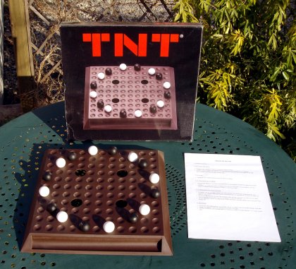 TNT se joue sur un tablier de 11 × 11 cases, quatre d'entre elles étant évidées au centre (voir photo). Le but du jeu est d'expulser toutes les billes adverses présentes sur le tablier. Au départ, le terrain est vide. Un tour consiste à introduire une pièce ou à en déplacer une déjà posée d'autant de cases que souhaité, en ligne droite, sans sauter une pièce ou un trou. Lorsque votre pièce termine sa course à côté d'une pièce adverse, celle-ci « explose » et vous pouvez l'envoyer dans l'une des trois directions libres, d'autant de cases que souhaité. Si la pièce adverse rencontre alors une de vos pièces, elle explose à nouveau dans la direction de votre choix. Le jeu est donc très libre, ce qui fait son intérêt. Attention à introduire suffisamment de pièces. Votre adversaire peut gagner en expulsant toutes vos pièces du tablier, même s'il vous en reste en réserve. L'éditeur a probablement cessé son activité car personne ne le connaît à l'adresse indiquée : Merci à Paul qui m'a gentiment offert TNT. |