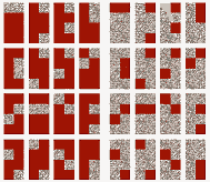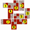 De fait, je ne sais comment vous décrire le plaisir que j'ai eu à jouer à Toscana, un excellent, et peu onéreux, petit jeu de Niek Neuwahl. Le matériel est composé d'un tablier de jeu de 17 × 17 cases neutres. La case centrale est légèrement mise en valeur. Le terrain représente le sol de la Toscane, sur lequel les bâtisseurs vont créer un village. L'un des joueurs dispose de seize tuiles de format 2 × 4 cases, représentant toutes les possibilités d'arranger deux toits et six cours. L'autre joueur dispose de seize tuiles de même format, représentant toutes les combinaisons possibles de six toits et deux cours. Les tuiles de chaque joueur sont brouillées et empilées en une seule pioche. Le premier joueur pose sa première tuile, de telle sorte qu'elle recouvre le centre. Puis, alternativement, les joueurs posent la tuile qui est au-dessus de leur paquet. La tuile doit impérativement toucher une tuile déjà posée, en prolongeant un élément du joueur concerné. Par exemple, si vous jouez les toits, l'un des toits de la tuile que vous posez doit toucher un toit déjà posé. Le but du jeu est, pour chaque joueur, de créer un toit ou une cour utilisant le plus de tuiles possibles. Par exemple, dans le début de partie du dessin ci-dessous, on note que le plus grand toit est constitué des cinq tuiles 1, 2, 4, 7 et 8. La plus grande cour recouvre quant à elle également cinq tuiles : les numéros 2, 3, 5, 6 et 9. On note que la tuile 2 est comptée pour chacun des deux joueurs.