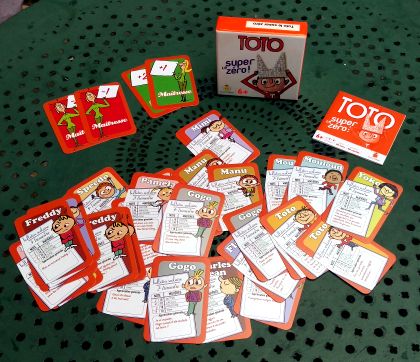 Le jeu Toto, le super-zéro rappelle un peu le jeu d'atout ou Top Trumps. Sauf qu'ici, le jeu n'oppose pas deux adversaires mais tous les joueurs de la table. Le joueur actif annonce une matière puis chacun choisit une carte de sa main. Il s'agit de ne pas révéler la meilleure note de la table. Tous les joueurs révèlent leur carte en même temps. En cas d'égalité, on procède comme à la bataille. Le malheureux bon élève doit piocher une nouvelle carte et comme le but est de se débarrasser de toutes ses cartes… Le hasard n'est pas seul à déterminer le vainqueur. Il faut se défaire au bon moment des cartes encombrantes. Posséder des cartes Charles-Jean en fin de partie quand la matière n'est pas le sport ne vous aidera pas à gagner !