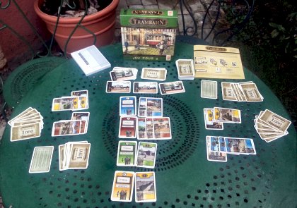 Après Patchwork, la collection des « Jeux pour 2 » chez Funforge s'enrichit d'un nouveau titre : Trambahn. Helmut Ohley, auteur du jeu multiprimé Russian Railroads et de nombreux autres jeux dans l'univers des trains, nous propose ici un jeu aux règles aussi simples qu'intelligentes. Les deux joueurs rivalisent pour créer des lignes de tramway et en encaisser les bénéfices. À tour de rôle, ils doivent décider de ce qu'ils font des cartes qu'ils ont en main et qui ont trois fonctions possibles. Ils doivent en poser une ou deux pour ajouter des passagers à un ou deux des quatre terminaux. Le reste des cartes doit être affecté soit à la construction de lignes de tramway, soit à la trésorerie en vue de l'acquisition de motrices. Lorsqu'un terminal vient de recevoir sa quatrième carte passager, il y a un décompte pour la ligne concernée, et ce pour chacun des deux joueurs. Au bout de dix décomptes la partie est terminée. Mais il est possible de gagner des bonus entre-temps en créant de longues lignes. Les parties sont rapides, très tendues et hautement interactives. Le hasard a certainement une grande part, ce qui explique que je perds plus souvent qu'à mon tour