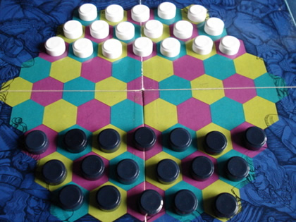 cases, elles-mêmes hexagonales, de 3 couleurs différentes