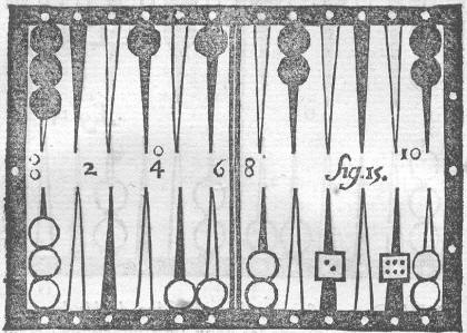 Le Grand Trictrac, Soumille, chez de Hansy, 1766, p. 14. Figure montrant l'emplacement des jetons en fonction des points marqués. 10 points se marquent en fait contre la bande. Les noirs ont 0 trou et 4 points, et les blancs n'ont encore rien marqué. (extrait de Wikipédia)