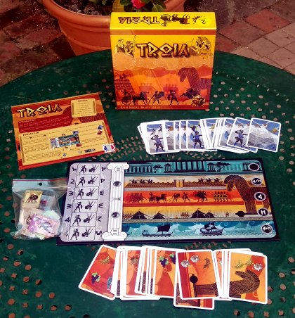 Deux joueurs mènent bataille à Troie. D'où le titre du jeu : Troia. L'objectif du Troyen comme du Grec est de remporter quatre victoires. Pour cela, il faut avancer les héros vers le camp adverse. Si à la fin d'un tour, vous parvenez à avancer deux héros dans le camp adverse, vous gagnez un point : un jeton si vous êtes un Troyen, une partie du grand cheval de bois si vous êtes un Grec. Les héros, figurines dressées entre les joueurs, ne sont pas identiques de chaque côté. Ce ne sont donc pas les mêmes cartes qui permettent de les avancer dans un sens ou dans l'autre. Un agréable jeu pour deux stratèges.