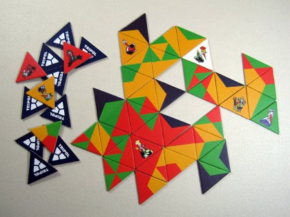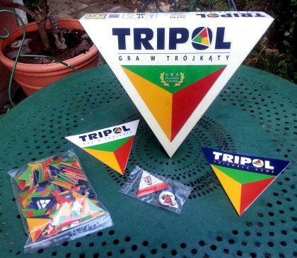Tripol est un jeu de domino1t3c, comme Le Trioker ou Triominos mais la ressemblance s'arrête là. Car ici, la manière de marquer des points est particulièrement alambiquée. On ne pose qu'une seule pièce à son tour de jeu. La pose rapporte de 1 à 24 points et, parfois, le droit de rejouer. On n'a qu'une seule pièce en main, ce qui fait que le hasard reste assez important. Le jeu fait un peu penser à Dalapapa, ce qui le rend sympathique à mes yeux
