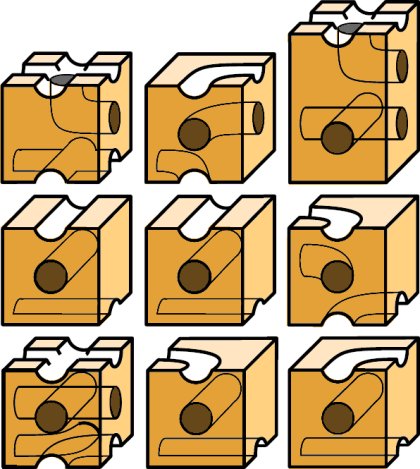 Les jeux ne manquent pas où vous devez créer un chemin passant par différentes pièces posées sur un tablier. Quand on ajoute la contrainte d'une structure en 3D, les candidats se font rares. Tricky Ways remplit donc une case presque vide (à l'exception de S.O.S. plombier et de l'excellent Passtah) de la classification de ma collection, celle des jeux où l'on doit créer des chemins en 3 dimensions. Tricky Ways propose deux règles de difficulté croissante. Dans la première règle, assez facile, les chemins ne passent que par la surface des cubes. C'est la deuxième règle qui donne tout son sel au jeu. L'un des cubes possède, comme la tour de lancement, une canalisation qui permet à la bille de descendre d'un niveau. Il est donc maintenant possible de créer un chemin qui passe par deux niveaux avant de terminer sa course dans l'une des cases du pourtour. Et là, ça devient très costaud !