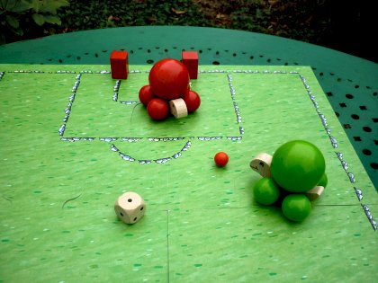 « Pourquoi ne pas utiliser l'autre face du plan de jeu ? », a dû se demander l'éditeur. Voici donc un jeu de football où le dé indique combien de fois on peut taper dans la balle avant de passer le tour à son adversaire. Pas un grand intérêt. On peut oublier cette règle et se consacrer aux quatre autres jeux.