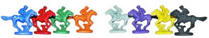 Doté d'un matériel exceptionnel, surtout si vous avez craqué pour la version « Exclusiv » avec ses chevaux peints, Turfmaster est aussi intéressant à jouer qu'il est beau à regarder. C'est clairement l'un des plus beaux fleurons de ma ludothèque, sinon le plus beau. L'éditeur n'a pas lésiné sur le matériel : chaque joueur reçoit en début de partie son jeu de cartes, son cheval et ses dés, le tout aux mêmes couleurs.
