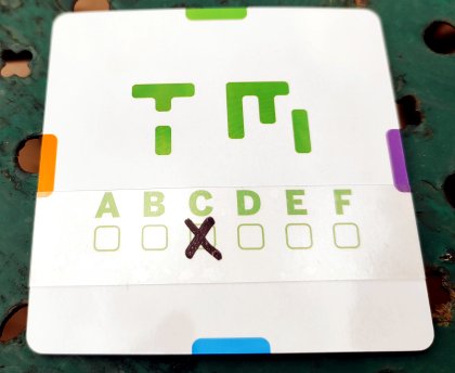 Le jeu présente un petit défaut. Il faut cocher sur la carte réponse la lettre correspondant à la question de la machine. Mais comme il s'agit de feutre effaçable et que les cartes sont prises en main, il est fréquent que la coche disparaisse. Pour palier ce souci, nous avons ajouté au matériel de jeu six petits manchons transparents sur lesquels une croix indélébile a été tracée. Il suffit d'enfiler le manchon en début de partie pour ensuite jouer tranquillement.