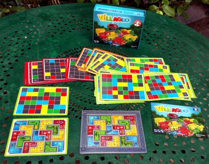 Villageo est un casse-tête géométrique proposant 60 défis de difficulté progressive. Vous devez placer 16 pièces formées de 3 carrés en angle — 4 rouges, 4 jaunes, 4 vertes et 4 bleues — de façon à respecter une règle de base et les contraintes du défi. La règle de base, c'est que deux pièces de même couleur ne doivent se toucher ni par un bord, ni par un coin. Les contraintes de chaque défi sont des cases déjà colorées qui indiquent qu'une pièce de cette même couleur doit avoir une de ces trois cases ici. Comme pour les problèmes de sudoku, la difficulté augmente avec la raréfaction des indications. Bon courage !