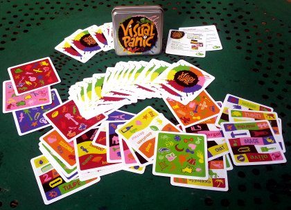 Amis daltoniens, désolé, Visual Panic vous sera totalement inaccessible puisqu'il est entièrement basé sur la détection rapide de couleurs de textes, d'images et de fonds. Fort heureusement pour les non-daltoniens, la législation n'interdit pas encore les jeux qui leur sont réservés L'idée ici est de déterminer le plus vite possible les mots ou images apparaissant dans la couleur annoncée à l'avance, parmi les six possibles. Si, par exemple, le joueur actif annonce « rose », il faudra trouver tous les mots écrits en rose ou toutes les images dessinées en rose. Mais pas les mots écrits sur fond rose ni les images dessinées sur fond rose. Comme ce serait trop simple, il ne faut pas non plus tenir compte des mots ou des images sur fond noir ou blanc ni ceux entourés de noir ou de blanc ! Si vous êtes le premier à trouver tous les mots ou images, vous cachez la carte avec la main et vous annoncez. Vous avez trouvé tous les objets ? Bravo, vous gagnez la carte. Vous avez fait une erreur, comme nommer un objet qui n'est pas de la couleur ou en oublier un ? Vous ne gagnez pas la carte et devez l'offrir à un adversaire de votre choix. Généralement le joueur le plus en retard ou l'élu(e) de votre cœur. Comme ce serait trop simple, des caméléons viennent compliquer un peu l'affaire. Réservé aux amateurs de jeux frénétiques !