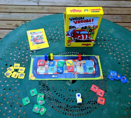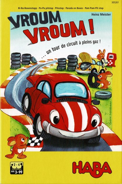 Vroum Vroum ! est une curieuse course de voitures dans laquelle les voitures ne sont jamais en piste : elle cheminent de stand en stand, au hasard des dés, d'abord chez le mécanicien, puis à la pompe à essence, enfin au gonflage de pneus. Chaque joueur à son tour lance les deux dés. On place alors une tuile de chacune des couleurs obtenues sur le premier stand où il n'y a pas déjà trois tuiles. Dès que les trois tuiles d'un stand ont été posées, la voiture quitte le stand et va au stand suivant, ou à l'arrivée s'il quitte le troisième stand. Le gagnant sera donc le premier joueur dont la voiture quittera le troisième stand pour franchir la ligne d'arrivée – en résumé, le gagnant sera le premier joueur dont la couleur aura été tirée neuf fois, puisque le mécanisme du jeu est le hasard pur.
